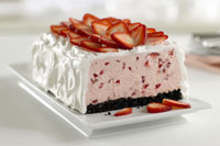 INVERT dessert onto serving plate when ready to serve; remove pan and foil. Spread remaining whipped topping onto top and sides of dessert. Slice remaining 2 cups strawberries; arrange over dessert. Store leftovers in freezer.